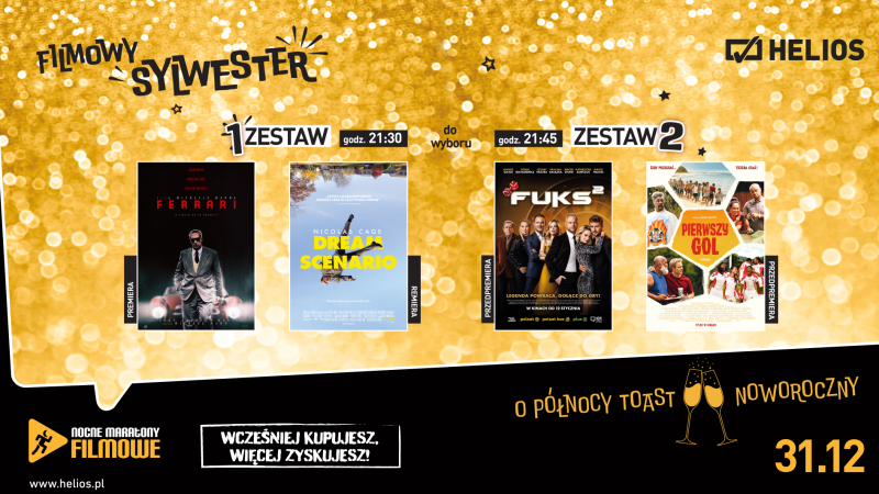 Już tradycyjnie sieć kin zaprasza na Filmowego Sylwestra, dzięki któremu kinomani mogą spędzić ten niezwykły wieczór z gorącymi nowościami. Zestaw 1 to propozycja dla koneserów światowego kina, pełna wyczekiwanych premier – znajdzie się w nim biograficzny film „Ferrari”. Bohater, twórca słynnej wytwórni samochodów, rusza w najtrudniejszym wyścigu swojego życia. W jego rolę brawurowo wciela się Adam Driver, któremu partneruje Penélope Cruz. Po przerwie na powitanie Nowego Roku, na wielkich ekranach zagości poruszająca komedia „Dream Scenario” z Nicholasem Cagem w znakomitej roli głównej.