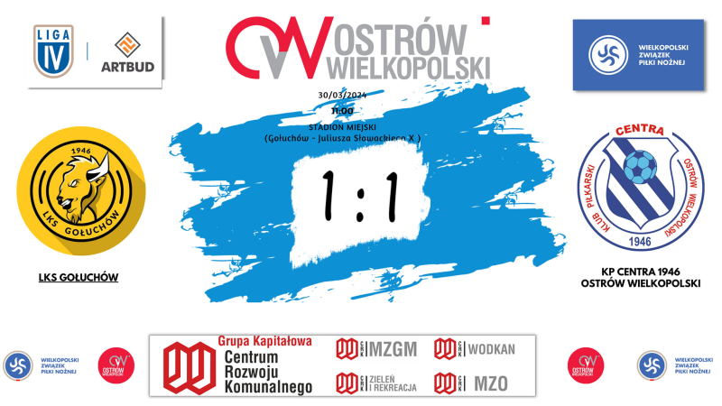 Mecz w Gołuchowie miał dwa oblicza. Już w pierwszych minutach Michał Kucharski dał prowadzenie Centrze, która z powodzeniem utrzymywała korzystny wynik do końca pierwszej połowy. Po przerwie LKS Gołuchów zdobył gola równie szybko jak stracił na początku pierwszej połowy i role się odwróciły, gdyż teraz to ostrowianie z większą determinacją ruszyli do ataku, jednak tym razem równie skutecznie gospodarze bronili dostępu do własnej bramki i mecz zakończył się podziałem punktów.