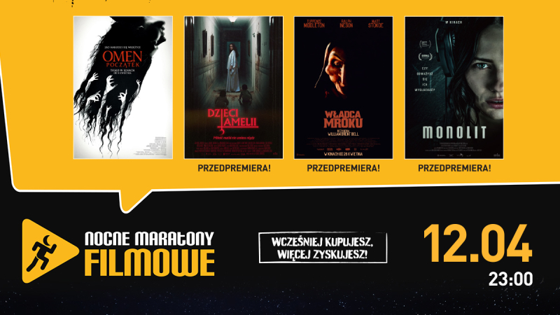 W piątek 12 kwietnia, kina Helios zapraszają na noc z filmami, których jedynym zadaniem jest... śmiertelnie Was wystraszyć. Zaczniemy wyczekiwanym „OMEN: POCZĄTEK”, w którym młoda Amerykanka wysłana do Rzymu napotyka mroczne siły, przez które zaczyna kwestionować swoją wiarę i odkrywa przerażający spisek mający na celu sprowadzenie na świat zła wcielonego. Po krótkiej przerwie przedpremierowe pokazy horrorów „DZIECI AMELII”, „WŁADCA MROKU” i dla tych którym wystarczy jeszcze odwagi „MONOLIT”. Jesteśmy przekonani, że taka dawka obezwładniającego strachu jeszcze długo po powrocie do domu nie pozwoli Wam zasnąć. Czy jesteście na to gotowi?