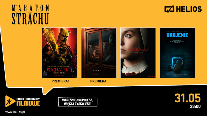 W piątek 31 maja, kina Helios zapraszają na noc z czterema przerażającymi horrorami, po obejrzeniu których będziecie mieli obawy przed zgaszeniem światła nawet we własnym domu. Zaczniemy wyczekiwaną premierą filmu „PUCHATEK: KREW I MIÓD 2”. Po spektakularnym sukcesie zakazanego w kilku krajach, niskobudżetowego horroru o Puchatku, twórcy uzbrojeni w nowe możliwości powracają z pełnokrwistym slasherem. Chwilę potem, druga premiera tej nocy, mrożąca krew w żyłach pierwsza część krwawej trylogii „STRANGERS”. Dla tych, którym wystarczy jeszcze odwagi, dwa kolejne, świetnie oceniane horrory - „NIEPOKALANA” i na zakończenie „UROJENIE”.