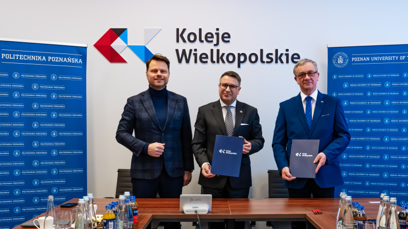 Dania 21 stycznia br. podpisano porozumienie o współpracy między Politechniką Poznańską, reprezentowaną przez Rektora, prof. dr. hab. inż. Teofila Jesionowskiego, a Kolejami Wielkopolskimi sp. z o.o., reprezentowanymi przez Prezesa Zarządu, Pana Marka Nitkowskiego oraz Członka Zarządu - Mikołaja Grzyba.