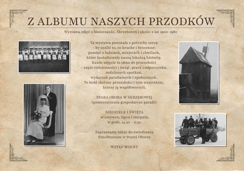 Od 12 czerwca muzeum wzbogaca nowa, wyjątkowa wystawa: „Z albumu naszych przodków” - to aż 152 fotografie z lat 1900–1980, pochodzące z Moszczanki, Skrzebowej i okolicznych miejscowości. Wystawa to nie tylko zapis wielkich wydarzeń, ale przede wszystkim codziennego życia, rodzinnych chwil i parafialnych uroczystości – tych, które tworzyły tożsamość lokalnej społeczności. Na zdjęciach odnaleźć można twarze naszych przodków, znajome podwórza, nieistniejące już zabudowania – a także mieszkańców, którzy żyją wśród nas do dziś. To wzruszające świadectwo lokalnej historii, które warto zobaczyć.