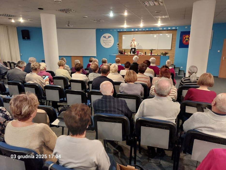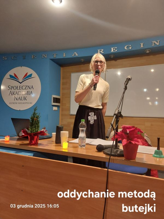 Tak też było w dniu 3 grudnia 2025 roku w auli Społecznej Akademii Nauk w Ostrowie Wielkopolskim podczas wykładu audytoryjnego połączonego z ćwiczeniami oddechowymi prowadzonego przez Panią Izabelę Strąk, trenera oddechu, który w zakresie swoich kompetencji wspiera innych w odkrywaniu i praktykowaniu świadomego, ukierunkowanego oddechu. To było niezwykle pożyteczne i interesujące spotkanie edukacyjne na temat: „Z oddechem po zdrowie – moc świadomego oddechu”.