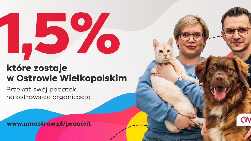 Przekazanie 1,5% podatku nic nie kosztuje, a może znaczyć bardzo wiele. Wystarczy podczas rozliczenia PIT wskazać wybraną organizację. To prosty gest, który ma ogromną moc. Ostrów Wielkopolski to ludzie z pasją i sercem do pomagania. Dołącz do nich. Spraw, by Twoje 1,5% zostało w naszym mieście. Pełny wykaz Organizacji Pożytku Publicznego w Ostrowie Wielkopolskim znajdziesz na www.imostrow.pl/procent. Rozliczanie PIT za 2025 rok rozpoczyna się 15 lutego 2026 roku i potrwa do 30 kwietnia 2026 roku.
