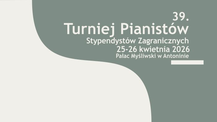 Stowarzyszenie "Wielkopolskie Centrum Chopinowskie - Antonin" w Ostrowie Wielkopolskim zaprasza na 39. Turniej Pianistów Stypendystów Zagranicznych o nagrodę im. księcia Antoniego Radziwiłła, który odbędzie się w Pałacu Myśliwskim w Antoninie, w dniach 25-26 kwietnia 2026, o godz. 17:00.
