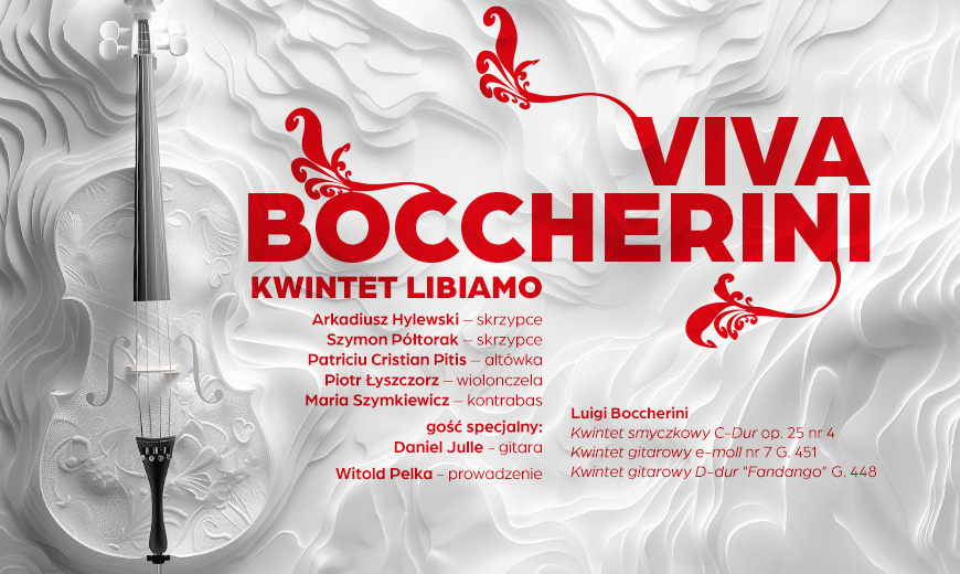19 kwietnia Filharmonia Kaliska zaprasza na koncert kameralny VIVA BOCCHERINI w wykonaniu kwintetu smyczkowego LIBIAMO z gościnnym udziałem estońskiego gitarzysty klasycznego - Daniela Julle. Muzycy złożą hołd wybitnie melodyjnej twórczości Luigiego Boccheriniego, interpretując kwintety smyczkowe i gitarowe włoskiego kompozytora. Koncert poprowadzi Witold Pelka.