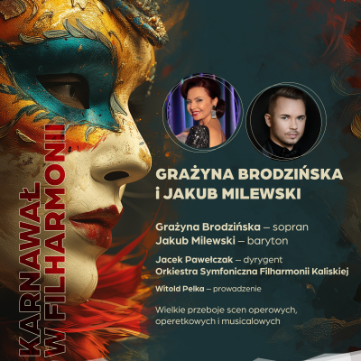 W czasie karnawału Filharmonia Kaliska zaprasza na dwa wydarzenia z wyjątkowymi wokalistami w rolach głównych – już 19 stycznia odbędzie się koncert z udziałem Grażyny Brodzińskiej i Jakuba Milewskiego. Karnawał zamkniemy 2 lutego, kiedy to kaliscy melomani obejrzą widowisko koncertowe Kobiety Świata, podczas którego rozbłysną gwiazdy polskich scen operowych.