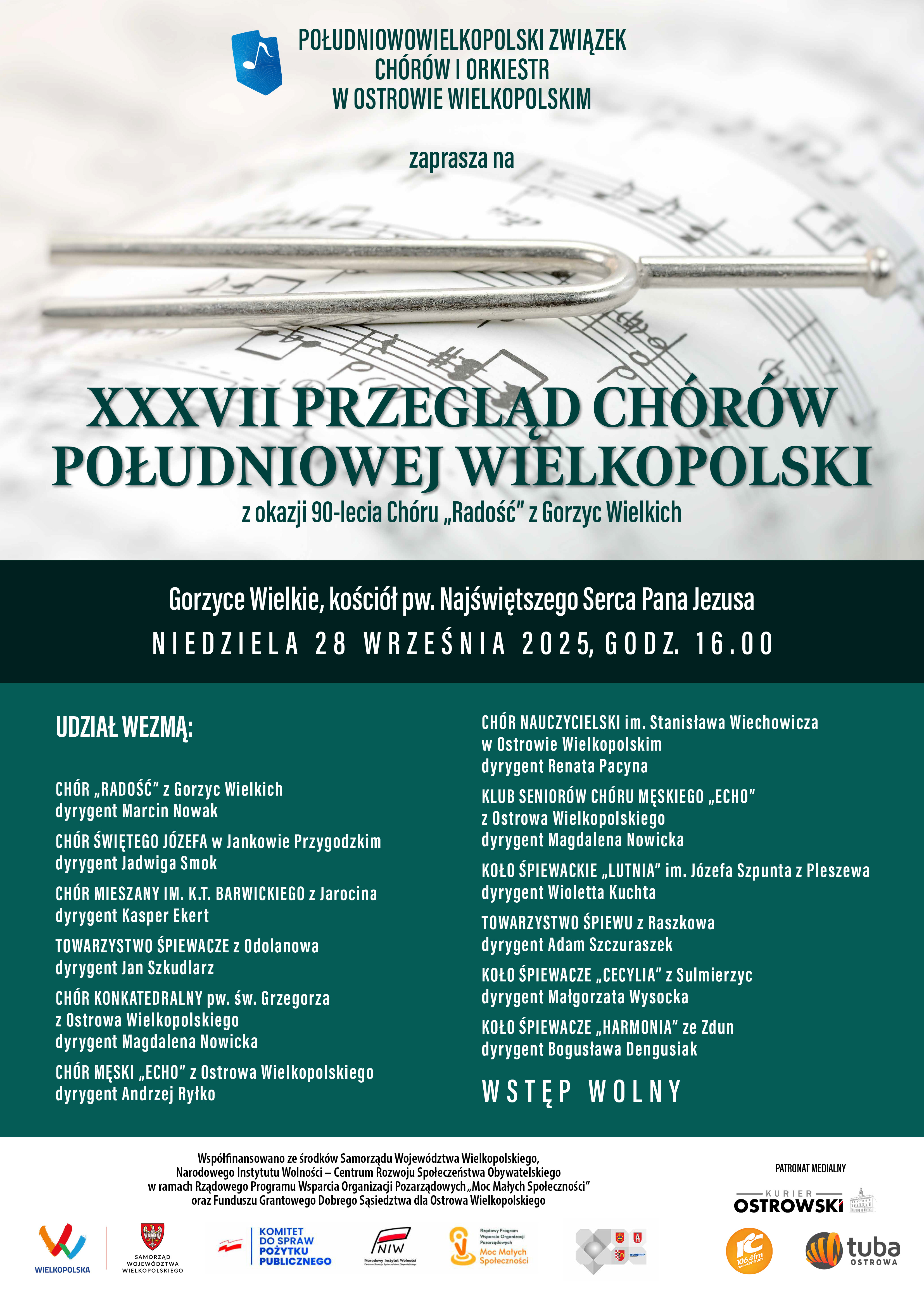 Południowowielkopolski Związek Chórów i Orkiestr w Ostrowie Wielkopolskim zaprasza na XXXVII Przegląd Chórów Południowej Wielkopolski, który odbędzie się w niedzielę 28 września 2025 roku o godz. 16.00 w kościele pw. Najświętszego Serca Pana Jezusa w Gorzycach Wielkich. Tegoroczna edycja połączona jest ze szczególnym jubileuszem – 90-leciem Chóru „Radość” z Gorzyc Wielkich.