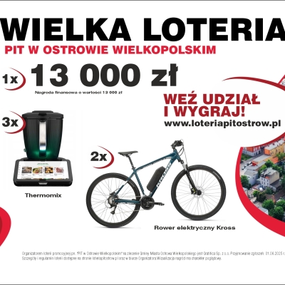 1 czerwca br. wystartowała pierwsza w historii miasta Wielka Loteria PIT w Ostrowie Wielkopolskim. To inicjatywa skierowana wyłącznie do osób pełnoletnich, które w swoim rozliczeniu podatkowym za ubiegły rok wskazały Ostrów Wielkopolski jako miejsce zamieszkania. Udział w loterii można zgłaszać do 20 lipca br.