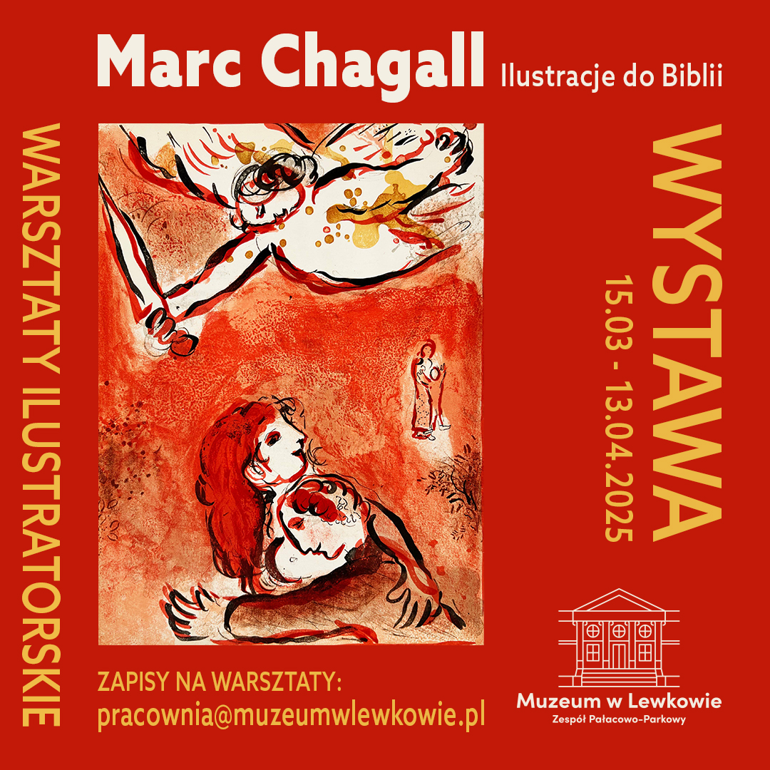 Barwne ilustracje Marca Chagalla do scen biblijnych zaprezentowane zostaną w Muzeum w Lewkowie - Zespół Pałacowo-Parkowy w dużej oranżerii od 15 marca do 13 kwietnia 2025r. Na ekspozycję składają się 24 barwne litografie Chagalla, pochodzące ze zbioru wydanego w 1960 r. w paryskim wydawnictwie Teriade.