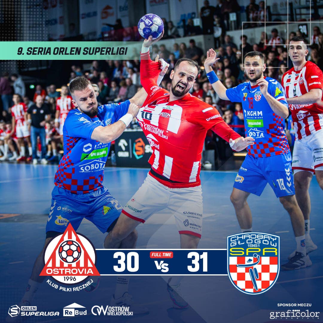 Po zaciętym meczu KGHM Chrobry Głogów okazał się minimalnie lepszy od Rebud KPR Ostrovii wygrywając 31:30.